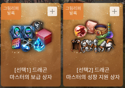 드래곤 마스터의 성장 지원 상자는 기존 서버와 그림리퍼&발록 서버가 동일하게 제공됩니다. 구성품이 똑같습니다.